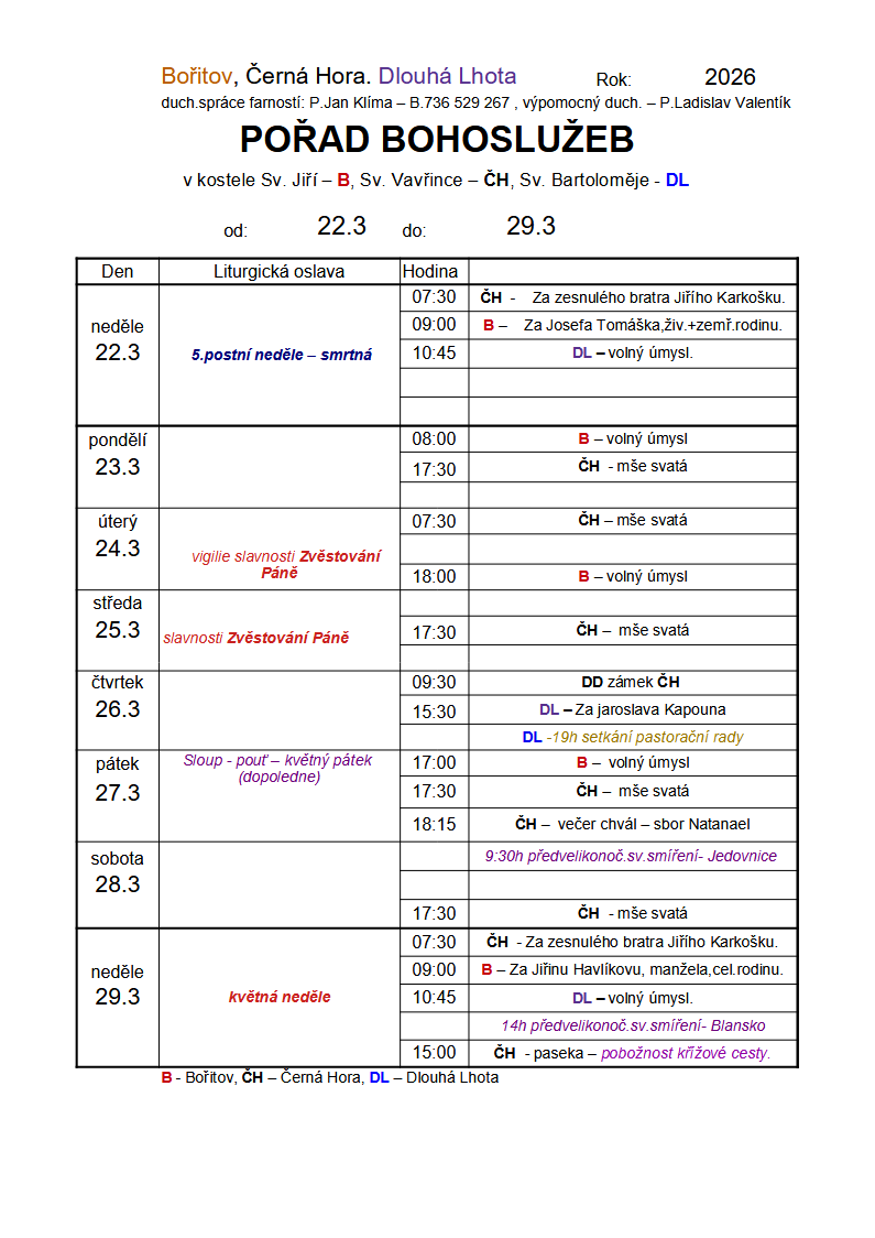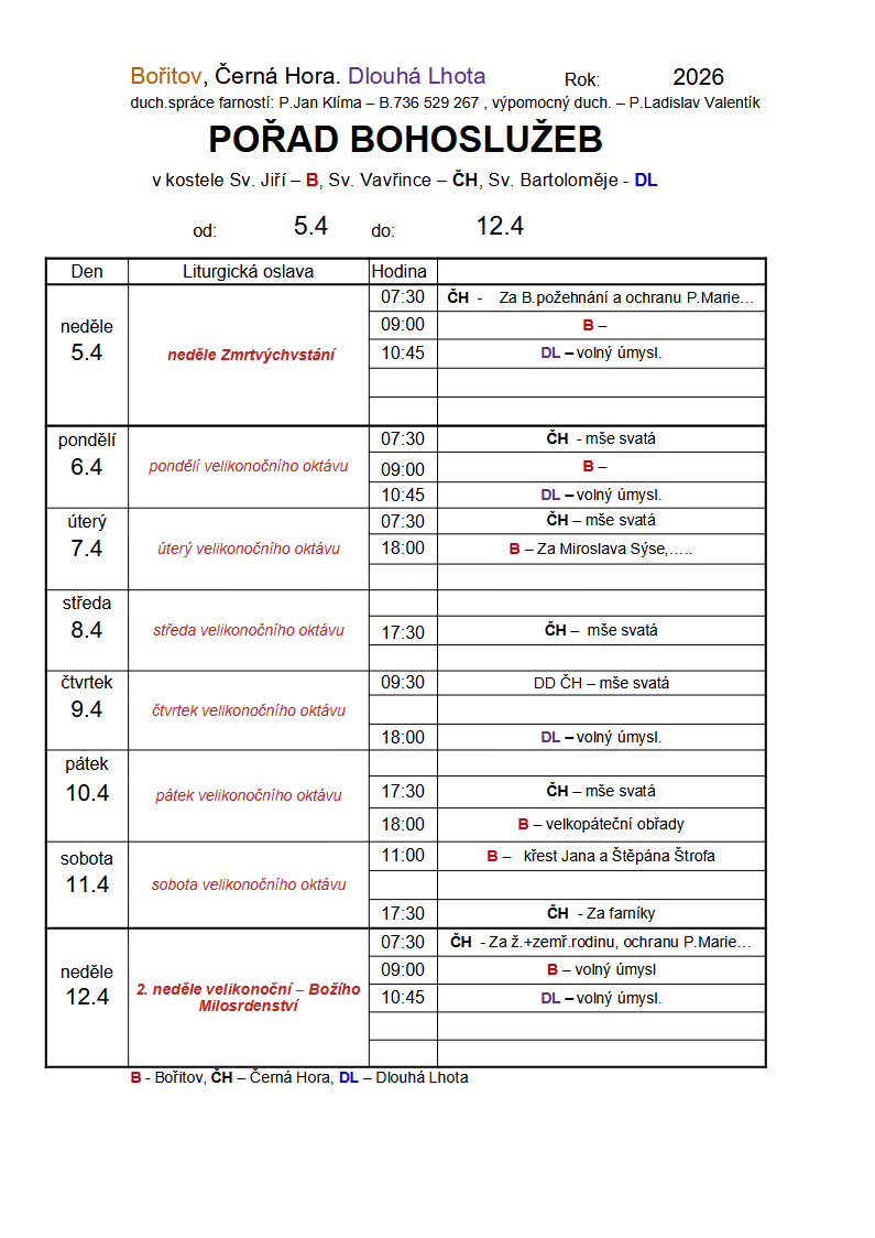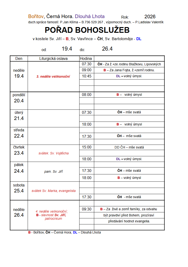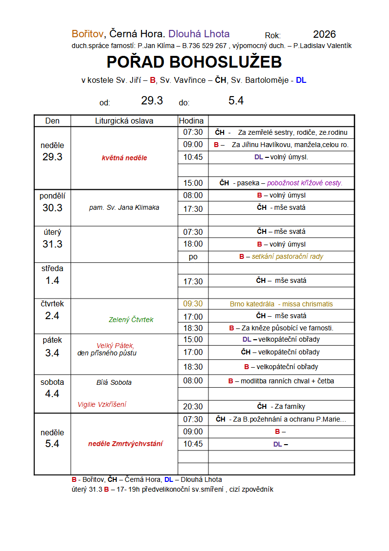 Kompletní přehled bohoslužeb v Černé Hoře je na úvodní stránce.