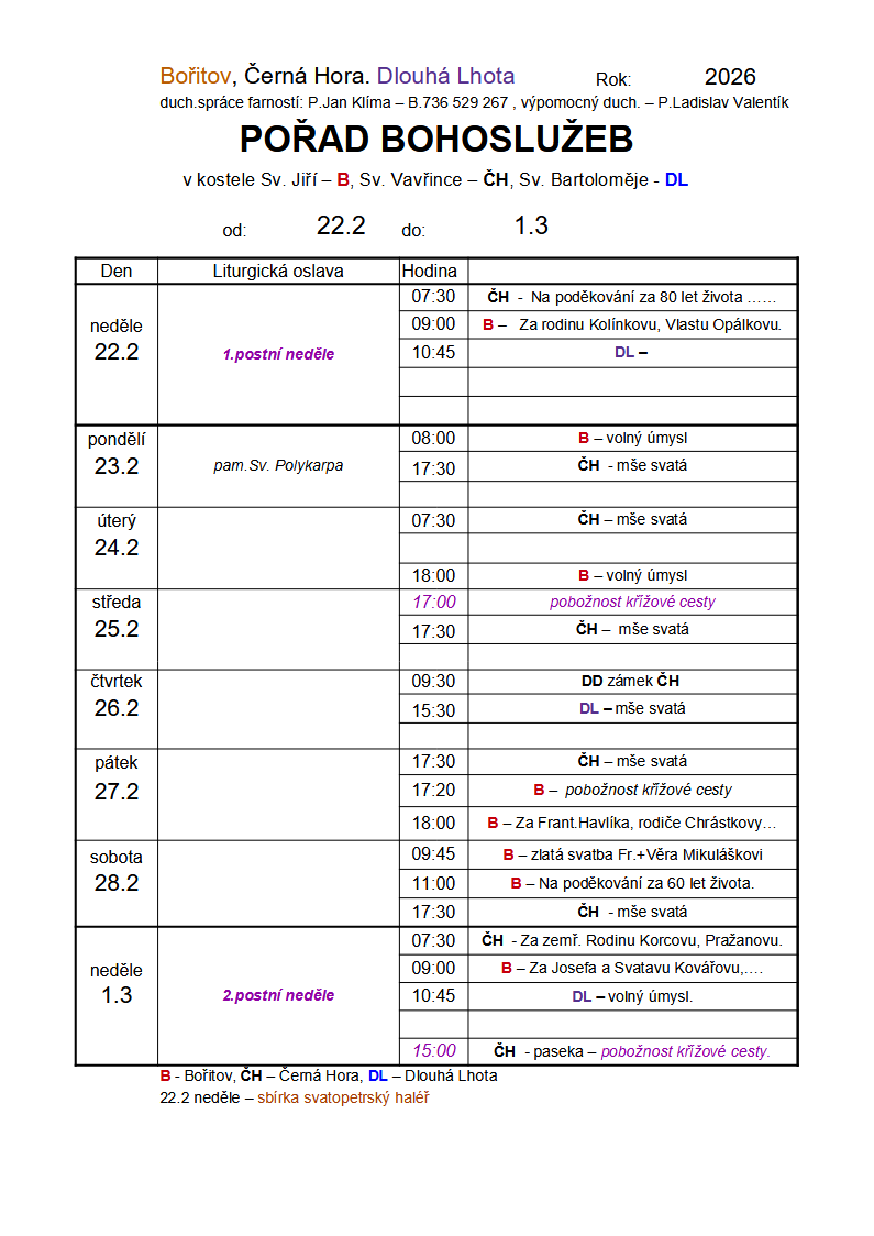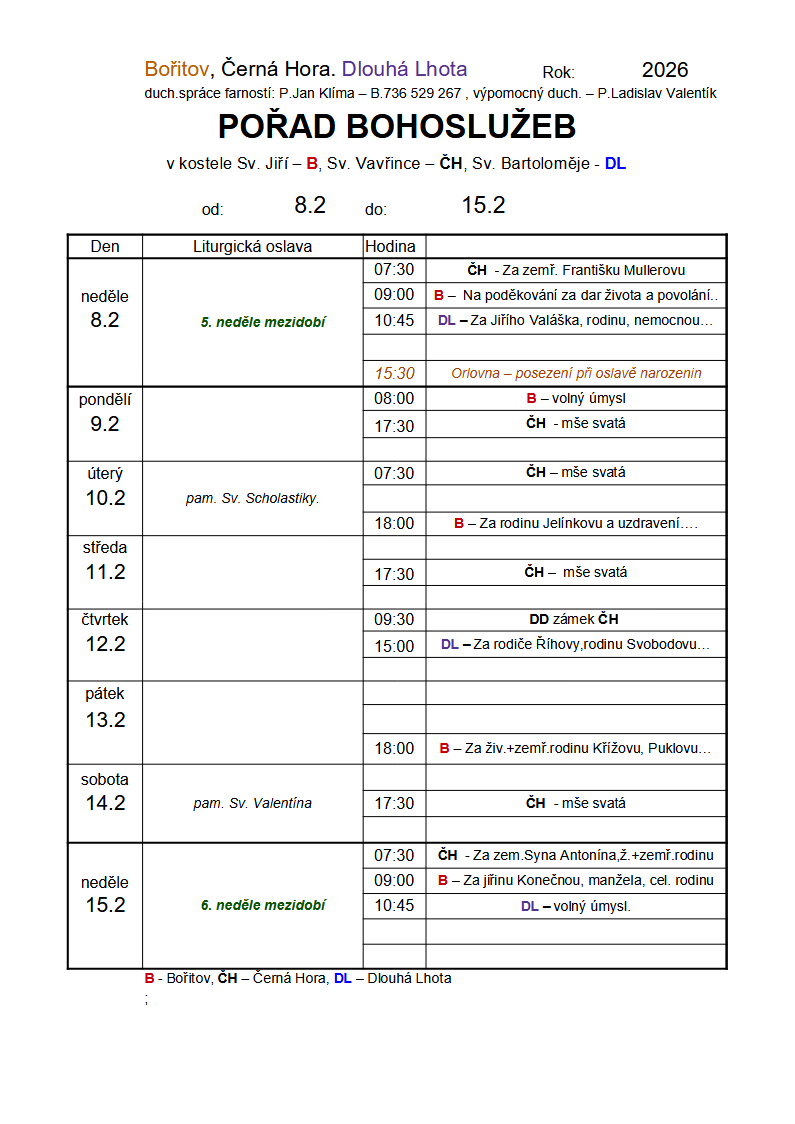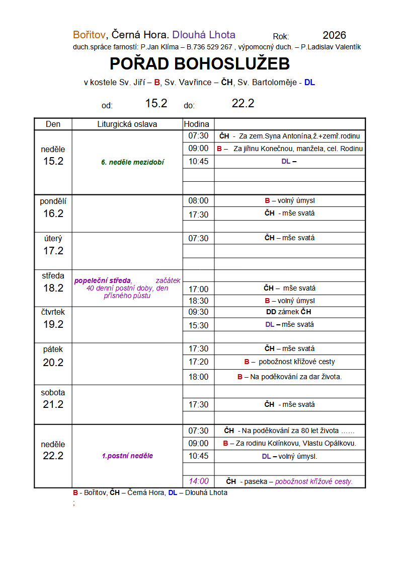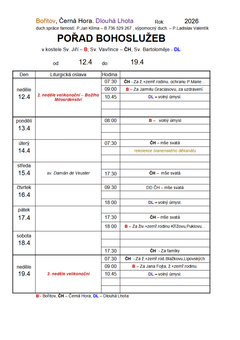 Kompletní přehled bohoslužeb v Černé Hoře je na úvodní stránce.